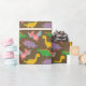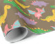 Ett gulligt och färgglatt slående in papper med ett dinosaurmönster som inkluderar dinosaursnågot liknande en gul Brachiosaurus som mumsar på löv, en purpurfärgad Triceratops, en grön Stegosaurus och en rosa Pterodactylus. Underbar för inpackning av gåvor för födelsedagpojkar som älskar Jurassic, förhistoriska eller dinosaurteman. Brun bakgrund kan ändras i customisationfunktionsläge.