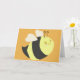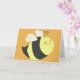 Ett hälsningkort som presenterar ett gulligt och lyckligt bi på en orange bakgrund.