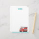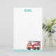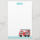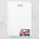 En brevpapper med ett gulligt rött avfyrar lastbilen som har vitrandar på dess sida och en infällbar stege med att vattna med slang. Lutade blåttrandar på den nedersta gränsen. Färga paletten av rött, blått, grå färg och vit. Text läser "memoen". Underbar för ungarna, speciellt pojkar, som älskar fordonleksaker och avfyrar motorer!