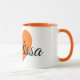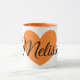Färgorangen symboliserar kreativitet, framgång, roligt, glädje och många andra bra saker! Detta är ett ursnyggt stort orange hjärtatryck på muggen för vitpersonligkaffe! Will gör en underbar gåvaidé för någon kaffeälskare! Tillfoga precis henne som är känd!