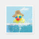 Gummigummi i gult med solglasögon och sol hatt i vatten stänk på akvafblått.
