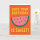 Det här trevliga födelsedagskortet har en fetstilt bakgrund med en skarp rosa vattenmelonillustration och en knivskarp gult med texten "Hoppas att din födelsedag är söt!" Perfekt för sommaren firande, barnens födelsedagar eller alla som kärlek leker fruktiga vibes. Roligtens reflextypsnitt och pulserande färg gör det till ett utmärkt val att skicka soligt önskemål.