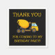 Gult och svartcementblandare lastbil barns födelsedagsfest "tack" för pappra blöjor. Texten säger: "Tack för att du kom till min födelsedagsfest"