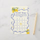 Gör din firande-roligt med den här Personlig Gulten Blue Main Squeeze Möhippa Bingo Game! Perfekt för ett tema med snabb möhippa. Spelet har en charmerande citrondesign som gör att evenemanget får en ny beröring. Oavsett om du planerar en huvudklämning av möhippan citron party eller tittar för inspiration av citrontemat för möhippa, är det här bingo-spelet ett underbart tillägg. Idealisk för citrontemat möhippa, citroner från italienska teman möhippa och sommartankar!