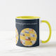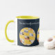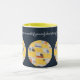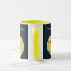Mörk blått mugg med gultens cirkel mönster. Ljusa fläckar för ditt kök, perfekt för abstrakt och stil älskare och dem som vill hitta skönhet i vardagen. Du kan byta ut texten "Du ser inte världen om du bara tittar igenom ditt eget fönster" mot ditt eget.