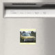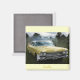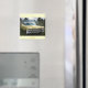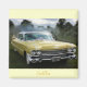 En magnet med en teckning av en 1950-talskupp i gulten Cadillac.
