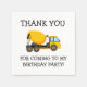 Gult cementblandare lastbil barns födelsedagsfest "tack" pappra blöjor. Texten säger: "Tack för att du kom till min födelsedagsfest"