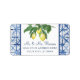Gult Lemons Citrus Foliage Blue White Bröllop-etikett för alla dina bröllop-kontorsbehov. Elegant, asiatisk inspirerad Shibori tie dye X mönster-bakgrund kombineras med klarfärgade citroner och citrusblad av grönt som var handmålade i akryliska vattenfärger på kanvas av en internationellt licensierad konstnär och formgivare, Audrey Jeanne Roberts, upphovsrätt.