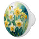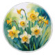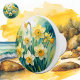 En delikat och drömmande vattenfärgsillustration av en bukett av daffodils i olika skuggor av ljus gult och grå vit, mot en mjuk, övertoningsblå bakgrund som framkallar en känsla av lugn och ro under våren.