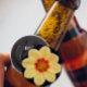 Rund, magnetisk flaska-öppnare som innehåller fotobilden av en gult Dahlia-blomma på en svart bakgrundsblomma. En underbar, blommigt design!