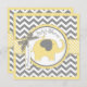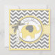 Gult elefant med fågelskåp på bog och grått och vitt chevrontryck samt 3D-seende båge och blåsor till babyduschmunkort.