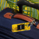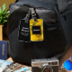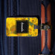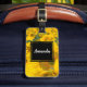 Ett bagagemärke med ett vackert foto av en fält av gult solblommor.