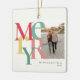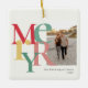 De här 2,75-tums x 2,75-tums julprydnadsämnena har en platshållare för ditt favoritfoto, namn och år. Brev i ord, Merry är stort och i olika färg av rött, grönt och gula på elfenbensbakgrund. Tillverkad av vit porslin, Fullt-färg, fullt-utfall, utskrift på båda sidor.