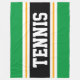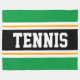 Den här sportetiska, atletiska designen har fet TENNIS-text inuti ett markerat svart rand med dubbla vit och gult tävla ränder mot ljusa yttre ränder för kellagnsgrönt. Texten kan vara personlig.
