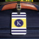 Modernt, eleganten och det moderiktiga geometriska nautiska randiga mönster eller designen i knaprig ren marinblå och vit görad randig bakgrund med en brytningcitron - gul rand och en beställnings- Monogram för personlig eller märka med sina initialer för reser hänger lös bagagemärkre. Klicka "skräddarsy" knäppas för att personifiera din gåva och för att tillfoga din egna initialer på bekläda och för att tilltala information på baksidaen. Välj dina egna stilsort och färger för att göra det ditt eget. Dessa snyggt och chic randar skrivar ut, eller den ska designen gör en underbar gåva för dig, eller någon som du älskar. Passande för manar, pojkar, kvinnor, flickor och tonåringar. För mer färger gå: zazzle.com/D_Zone_Designs