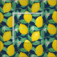 Dekorativ utformning av en mönster av gult juicy citroner på grenar med grönt löv och känsliga vita blommor på abstraktens mörk blått bakgrund. Obs! Du kan ändra storleken på rutorna för att justera hur stor teckning du behöver genom att klicka på knappen "Anpassa den!".