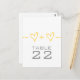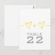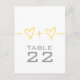 Cute and whimsical Heart Ekvation Bröllop Bordsnummer Postcard i gult med en roligt math ekvation "gående med" två hjärtan/människor. Den här fina designen är ett charmerande val för ett paret eller ett par som vill ha något enkelt, men med ett tips om stollig. Enkel att anpassa, lägg helt enkelt till rätt bordsnummer(er) på det utrymme som tillhandahålls. Klicka på Anpassa om du vill söka efter fler anpassningsalternativ.