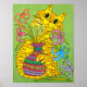 Denna eländiga gult strimlade katt kan helt enkelt inte motstå att leka med denna färgstarka, ornerade vas fullt av vackra pastellliljor. Sitta med svan inlindat runt vas har hon dragit ut en lila lily som ljuger på fötterna och stolt håller en annan oemotståndlig biet av den gång-omsorgsfullt arrangerade buketten, en ovanlig blå lilja, i munnen.