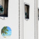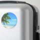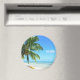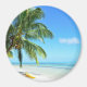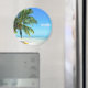 Rund fotomagnet från souvenir med en gult kayak under ett hängande handflatan träd på en vit sandstrand på den tropiska ön Morea, nära Tahiti, i Fransken Polynesien i Stillahavsöarna.