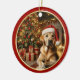 På framsidan av denna Helgdag är ett vackert porträtt på en gult Labrador Retriever-Hund som bär en julhatt och ljuger framför ett dekorerat Julgran och en skal paket. Bilden är ramad i glansigt guld och Helgdag rött. Baksidan av dekorationen har anpassningsbarna röd.