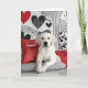 Gult Labrador Valentines kort. Kudda hund står mot contemporaryn i rött, svart och vitt. Inga blommor, bara hjärtan och väskor. Insidan är lämnat tom för ditt eget meddelande. Text på framsidan är redigerbar, liksom text och logotyp på baksidan av kortet.