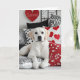 Gult Labrador Valentines kort. Kudda hund står mot contemporaryn i rött, svart och vitt. Inga blommor, bara hjärtan och väskor. Insidan är lämnat tom för ditt eget meddelande. Text på framsidan är redigerbar, liksom text och logotyp på baksidan av kortet.