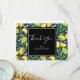 Tack för ett kort med söt mönster som innehåller citroner och kalkfrukter med löv på mörk grönt bakgrund.