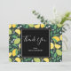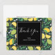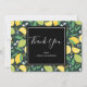 Tack för ett kort med söt mönster som innehåller citroner och kalkfrukter med löv på mörk grönt bakgrund.