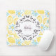 En muspekare med ditt monogram och namn inuti ett finare runt ram. Bakgrunden är designad med ett kantigt och sött mönster som består av gult citroner och pastel blåa blommor i ett stil som illustreras av hand plockade.