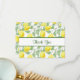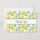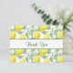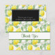 Ett tackkort med ett meddelande på baksidan. Designad med gult citroner och grönt löv, i ett upprepande mönster.