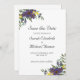 Bröllop spara datum-kort. Blommigt för lila Gult och Grönt Design med utrymme på baksidan för bröllop webbplats QR-kod.