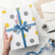 Svällning papper med ursprunglig vattenfärg som målar polka dot mönster i populär gult och grått färg på vit bakgrund.
