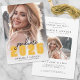 Klassiskt minimalistiskt Studenten-meddelande och partiinbjudan. Framsidan har ett foto på fullt med en vit övertoning i grund som tonas in i bilden utan problem. Över övertoningen visas "2025" i ett fet, klassiskt stil i gult guld. Över året finns "Student" i ett skriptteckensnitt, som kan ändras till "Klass av" om du vill. Under året är namn och namn i student elegant representerade. Den nuvarande designen användor svarta och guld-toner för ett tidslassigt och sofistikerat utseende, men allt färg kan anpassas för att matcha färg eller personliga inställningar. Baksidan förvandlas till en studentfest av snyggt med ett andra foto centrerat i en rundad rektangel. Nedan finns det utrymme för information om party, t.ex. datum, tidpunkt, plats och OSA, tillsammans med ett hjärtligt budskap från föräldrarna som firar student resultat. Du kan justera texten, typsnitt och färg så att de stämmer överens med stil. Perfekt för att tillkännage denna viktiga milstolpe och bjuda in nära och kära att fira!