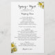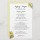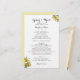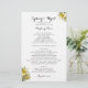Menymall blommigt bröllop med plumeriablommor. Vita och gula blommor dekorerar hörnen av vita pappra med svarta textmallar. Inkludera namn för briden och trimningen, platsen för händelsen, menyrubriken och datumet. Alla livsmedel och menyalternativ läggs till i ett stycke. Använda av mellanslag efter behov för att fylla i området. Pappra är prisvärd för en avslappnad bröllop eller överför designen till bättre papper som du vill.