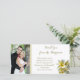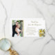 Tack för fotot från bröllop med plumeria-blommor. Lägg till ett foto i kant med text som skrivs ut över vitt. Söt gult och vita plumeriablommor dekorerar. Elegant och unikt sätt för det nyfödda par att tacka bröllopsfestens eller gästernas medlemmar för presenten.