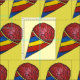 Struktur har rader med klassiska körsbärssnokoner i randiga röda, blå och gult pappra koner. Ett favoritkontrakt för varma sommarmånader! Skrivs ut på gulten blek.