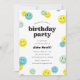 En roligt och en skarp inbjudan från barns födelsedag-partiet med gult, blåa och ljust grönt leende ansikte-ikoner. Kortets baksida har en gult och ett vitt styrt mönster som kostymer reflexen.
