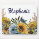 Mousepad med solblommor av söt, rustisk gult, med marin blå och dammig blommigt med blå vattenfärg och grön. Personlig med ditt namn i ett modernt penselskript.
