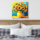 Bild av väggkonst med en strålande illustration av en gult solblommor i en söt gult vas som gjorts i ett impasto stil och en teal- eller turkobakgrund.