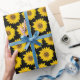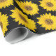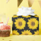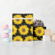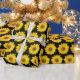 En mönster av ljusa solblommor med gult mot svart bakgrund med ett monogram brev i mitten av varje blomma.