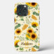 Anpassade namn och ett telefonfodral i monogram med färgade trädgårdsblommor, honungskomb och honungsbin, gult, brun och grönt färg.