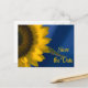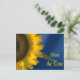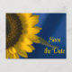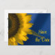 Ange tonen för sommar- eller hönshuset med den heliga Gulten Solros på blått Bröllop spara datum-vykort. Den här elegant anpassningsbarna botaniska behållan bröllop innehåller datumkortet ett blommigt foto av en vibrerande blommar av gult solros på blå bakgrund. Perfekt för ceremonin i sommarträdgården i party giftermål och mottagningen i firande.