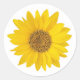 Ett närfoto av en stark solrosa i gult på vit bakgrund.