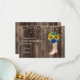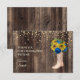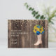 Anpassningsbar land-stil födelsedagsfest Tack för ditt kort med kortisonstövlar, ljusa solblommor av gult och vackert blått ro på en mörk brun träbakgrund.