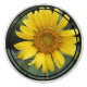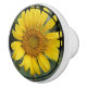 Solrosfrön av söt gult med frön i centrum för blommor och löv av grönt. Tittar vid blommigt genom en linseffekt med dubblans geometriska svarta cirklar. Originalfotografi © TamiraZDesigns.