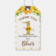Gult Solros Första födelsedag Favortagg Ljusblomman fick sin första födelsedagstag med ett stort faux guld glitter nummer, solros och gult punkter. Ett sött sätt att tacka flickans gäster för att de kom till hennes party. Det finns också samma inbjudan till designfödelsedagskalender.