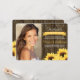 Tillfoga din favorit- pensionär klassificerar bilden till dessa meddelanden och inbjudningar för solrosstudentenfoto med en landvintageberlock. Painterly guld- gula solrosor gränsar denna nya akademikra inbjudan med en brun trästaketbakgrund med nagelhuvudklippning som påminner en av gammala ladugårdar, ett lantbrukarhem eller trumma. Tillfoga året av ditt avlägga examen klassificerar på den gula designen för bandbanerlooken. Studentenceremoni och det celebratory partyet specificerar kan tillfogas till baksidaen av denna inbjudan. Design© Chrissy H. Studio, LLC. All reserverad rättigheter.