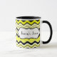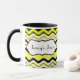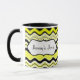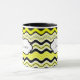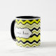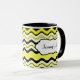Denna stilfulla gult, svart och vit vågigt den randiga keramiska muggen personifieras med din egna text. Underbar för lunchrooms eller högskoladorms. Du kan också välja annan stilar och storleksanpassar.