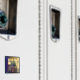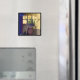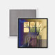 En av tre sak-gulter: tittar genom ett fönster vid vas av tulpaner, tre kvinnor i färgfulla klänningar och en muterad regnbåge över en bakgrund med gulter.