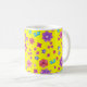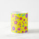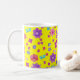 En söt, blommigt kaffe mugg, med en mönster av ljusa blommor i lila, turkos, rosa och orange mot bakgrund av solsken, från en handmålad gult kollage av Judy Adamson. Om du vill kan du enkelt ändra bakgrunden till färg genom att klicka på Redigera.